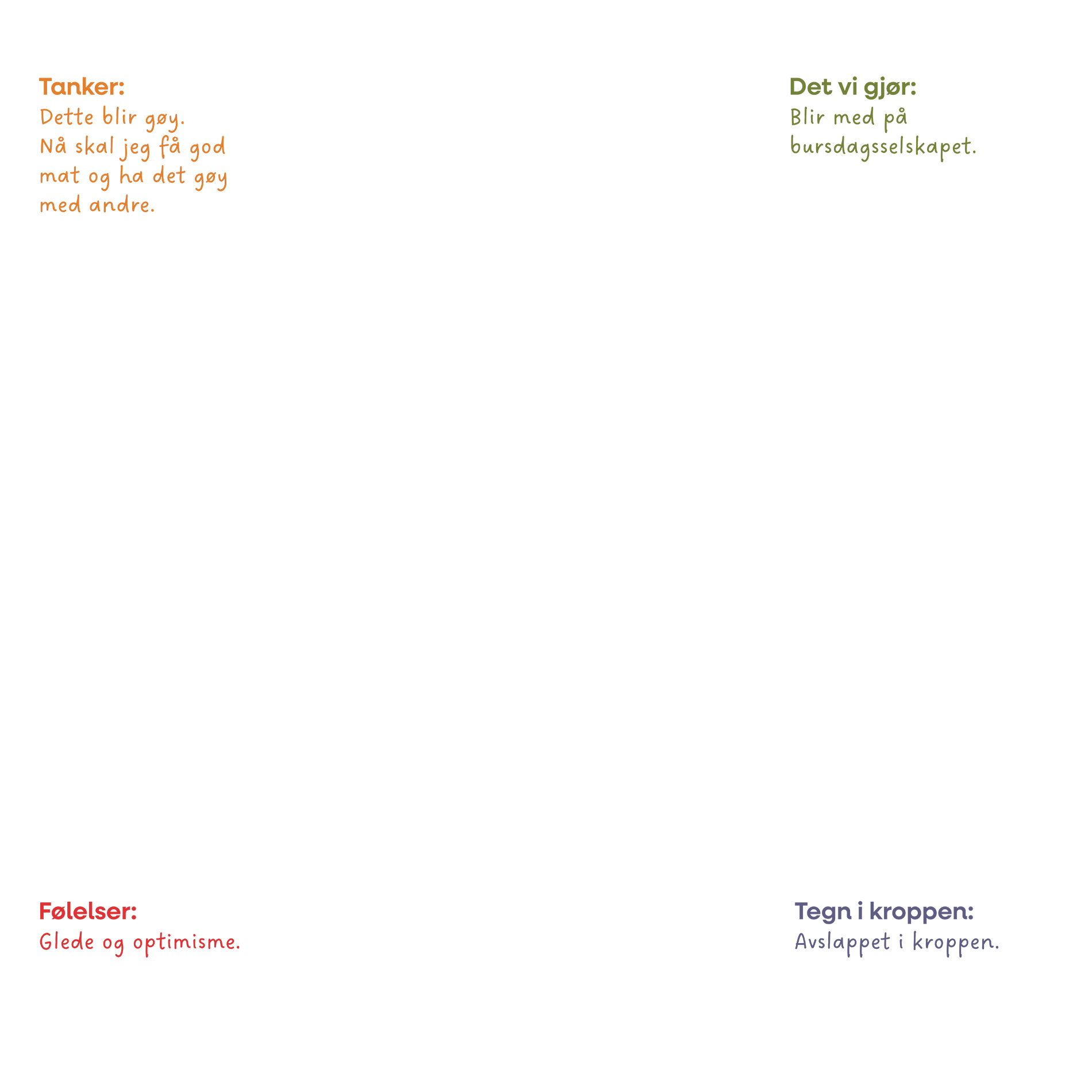Her er eksempler på noen tanker som professoren tenkte når han som barn ble invitert i bursdagsselskap. Kan du finne ut hvilke av disse som er + og – tanker?