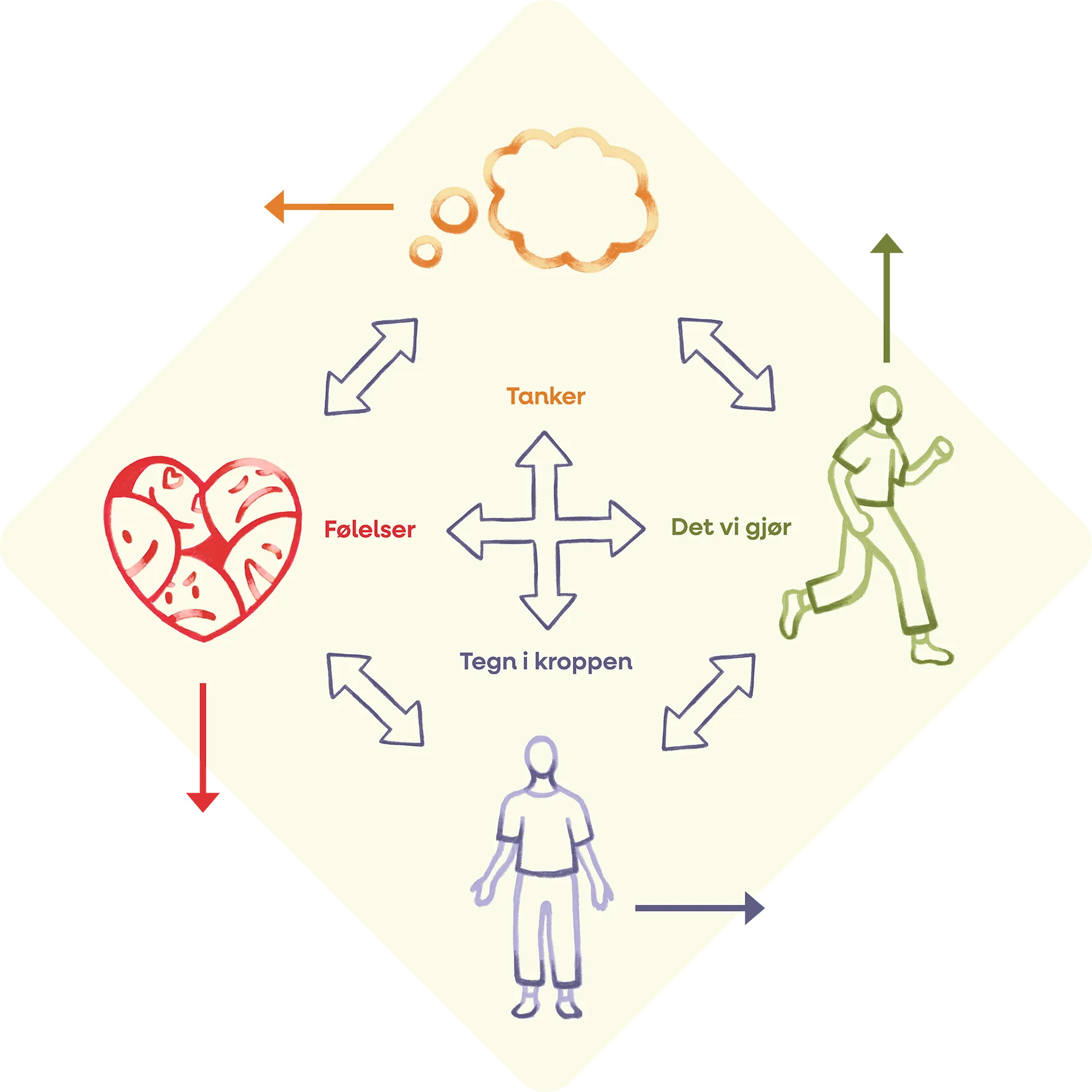 Tankene våre i ulike situasjoner henger også sammen med hvordan vi føler oss, kroppens reaksjoner og hva vi gjør (se eksempel nedenfor).